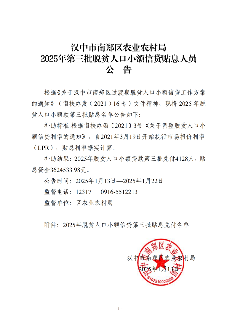 汉中市南郑区农业农村局2025年第三批脱贫人口小额信贷贴息人员公告