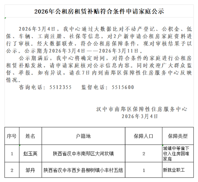 2026年公租房租赁补贴符合条件申请家庭公示