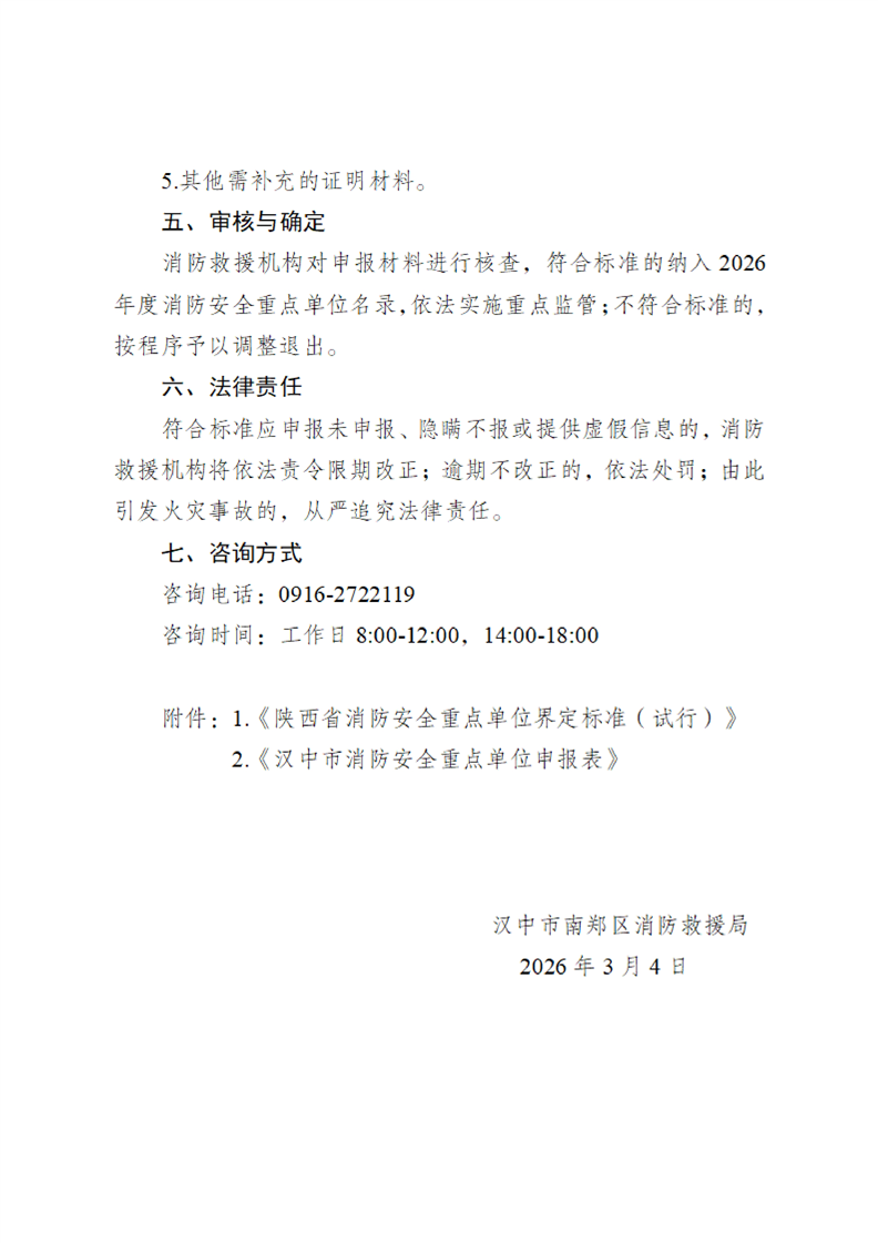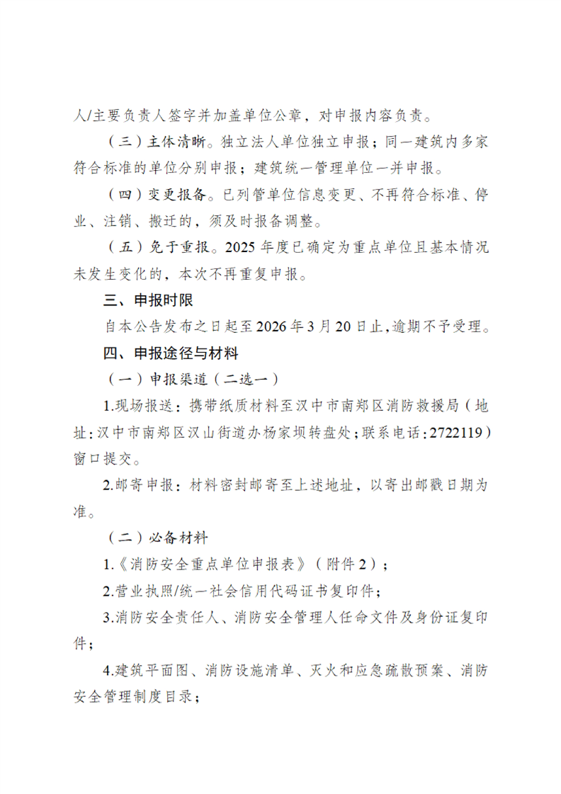 汉中市南郑区消防救援局关于开展2026年度消防安全重点单位申报调整工作的公告