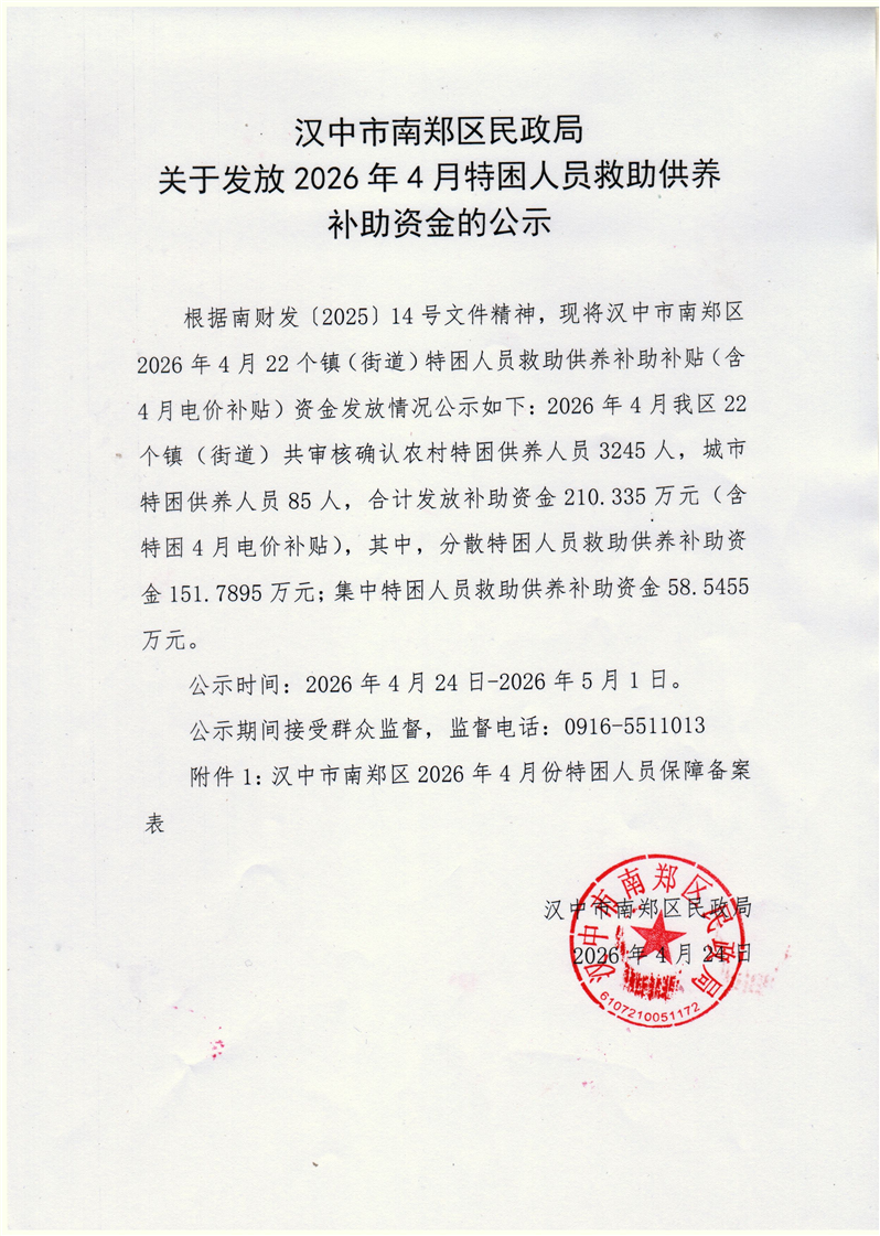 关于发放2026年4月特困人员救助供养补助资金的公示