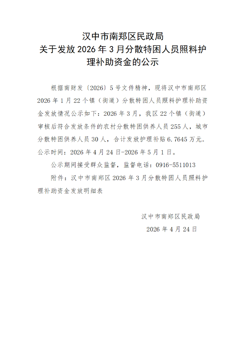 汉中市南郑区民政局关于发放2026年3月分散特困人员照料护理补助资金的公示