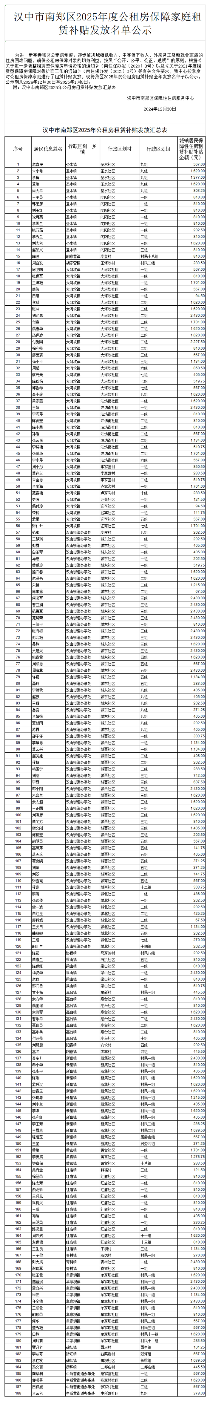 汉中市南郑区2025年度公租房保障家庭租赁补贴发放名单公示
