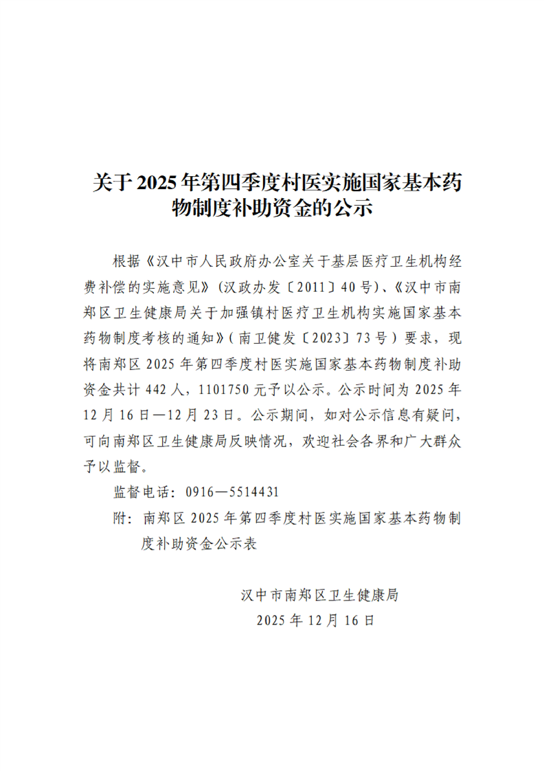 关于2025年第四季度村医实施国家基本药物制度补助资金的公示
