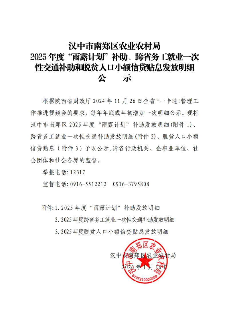 汉中市南郑区农业农村局2025年度“雨露计划”补助、跨省务工就业一次性交通补助和脱贫人口小额信贷贴息发放明细公示