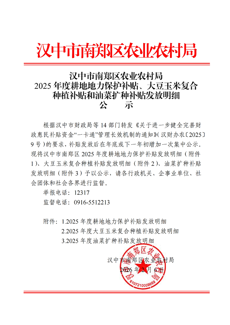 汉中市南郑区农业农村局2025年度耕地地力保护补贴、大豆玉米复合种植补贴和油菜扩种补...