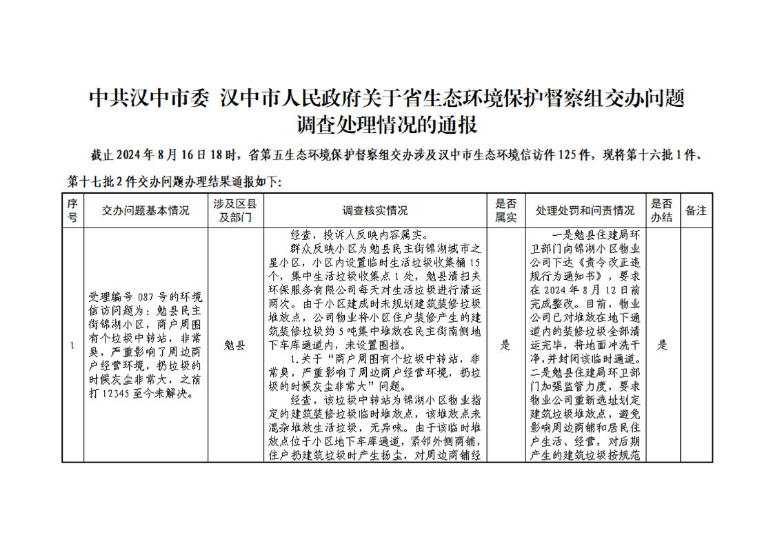 中共汉中市委 汉中市人民政府关于省生态环境保护督察组交办问题调查处理情况的通报