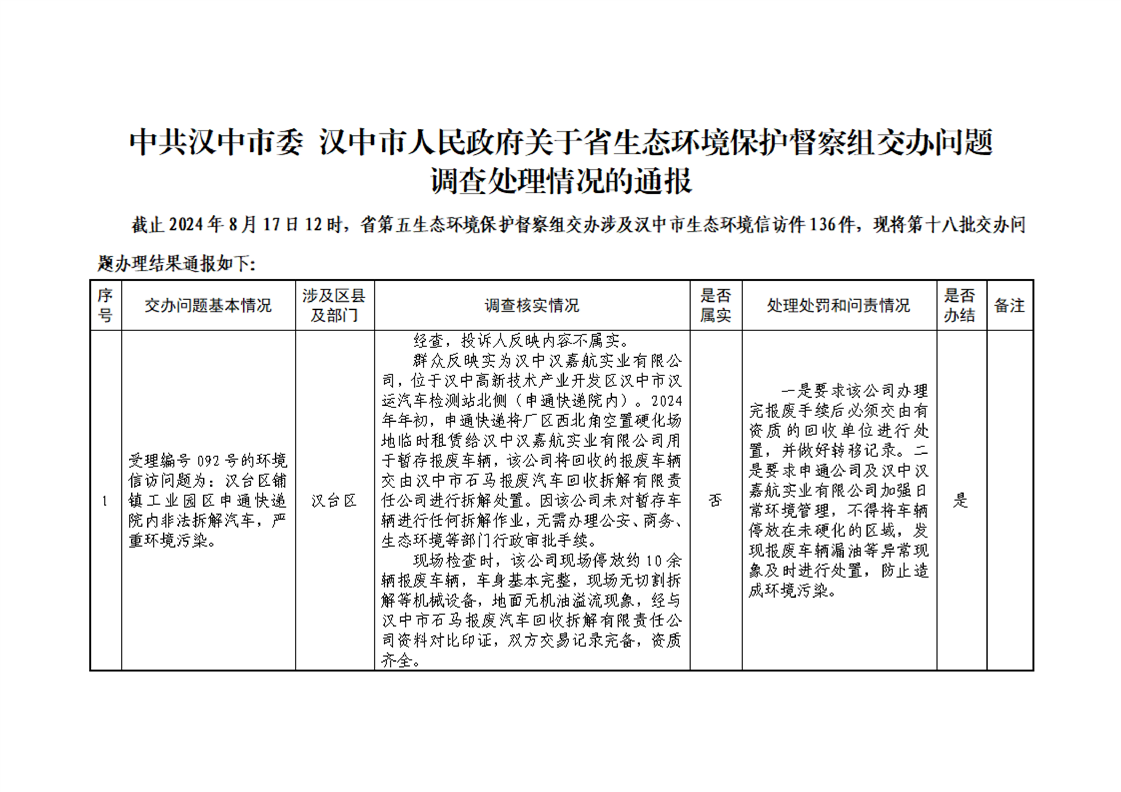 中共汉中市委 汉中市人民政府关于省生态环境保护督察组交办问题调查处理情况的通报