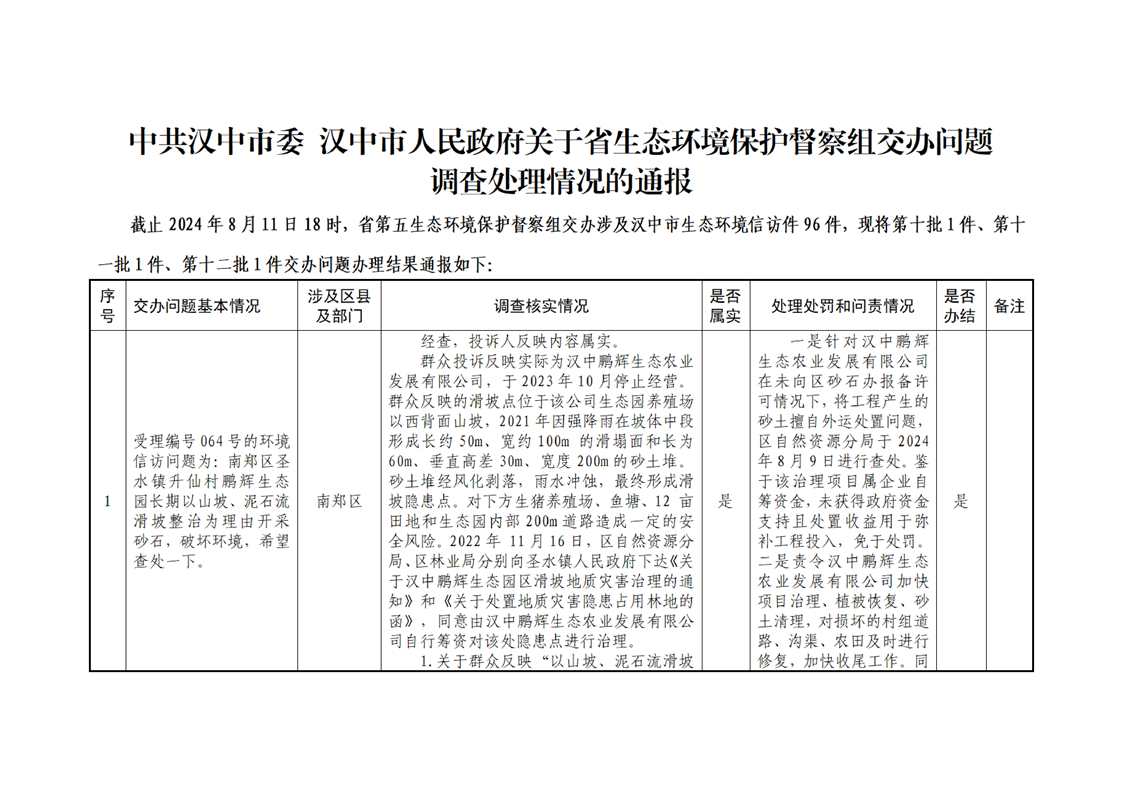中共汉中市委 汉中市人民政府关于省生态环境保护督察组交办问题调查处理情况的通报