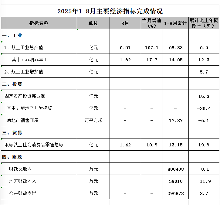 2025年1-8月主要经济指标完成情况