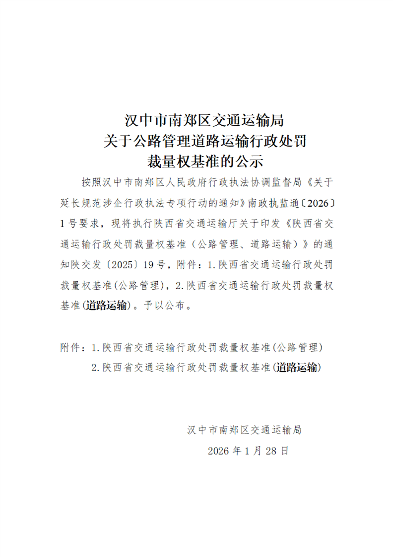 汉中市南郑区交通运输局关于公路管理道路运输行政处罚裁量权基准的公示