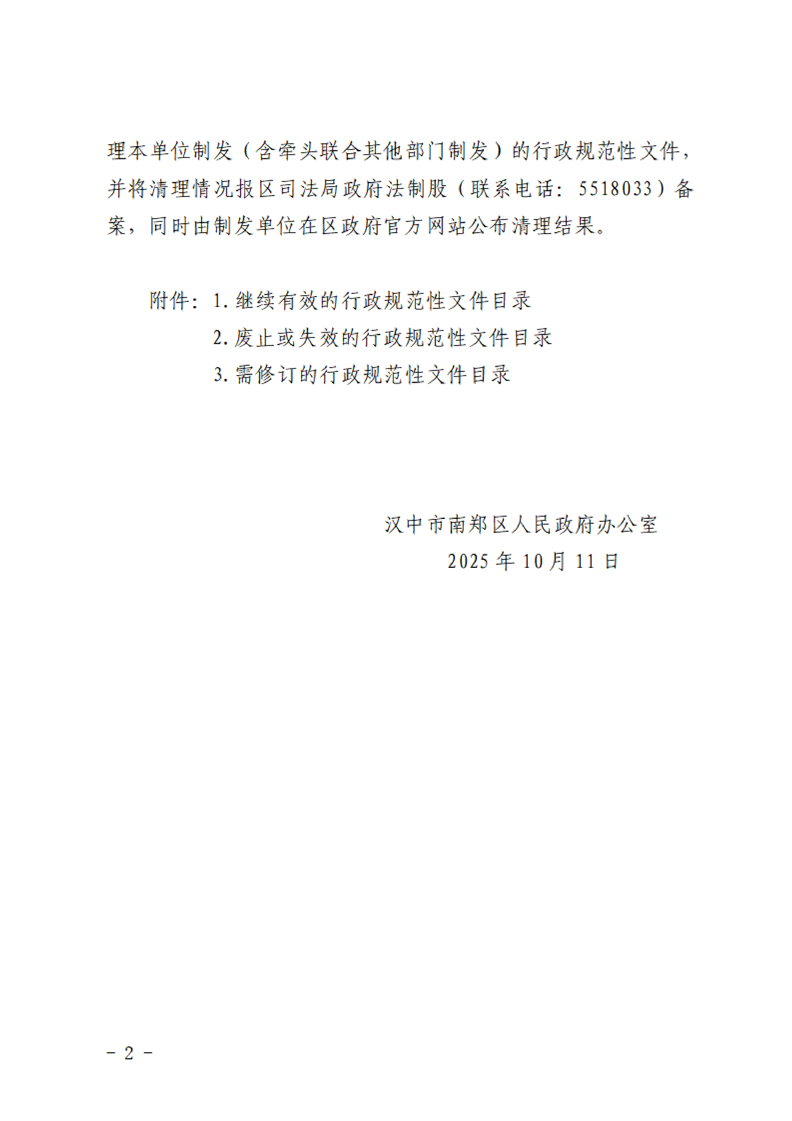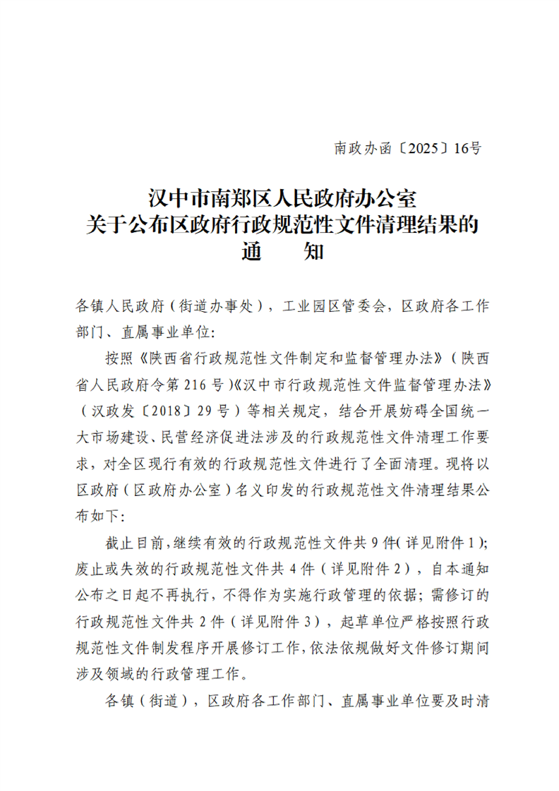 汉中市南郑区人民政府办公室关于公布区政府行政规范性文件清理结果的通知