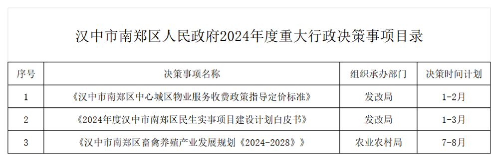 汉中市南郑区人民政府2024年度重大行政决策事项目录