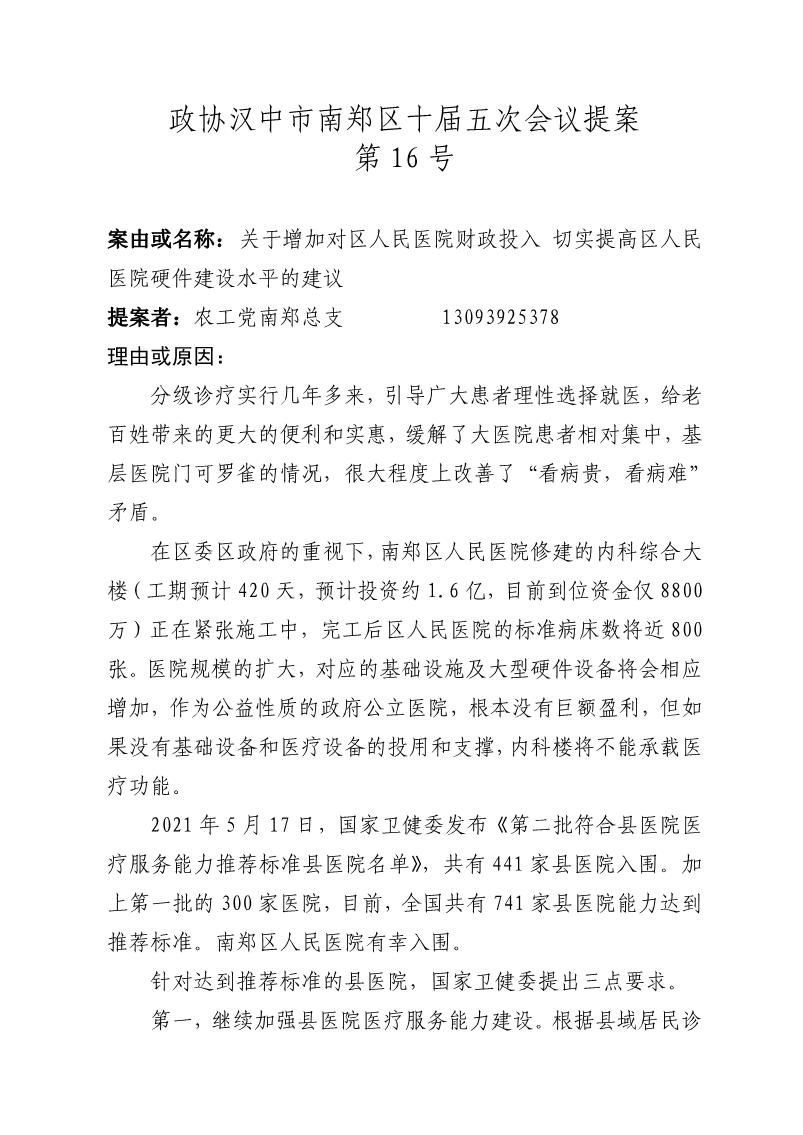 政协汉中市南郑区十届五次会议提案第16号