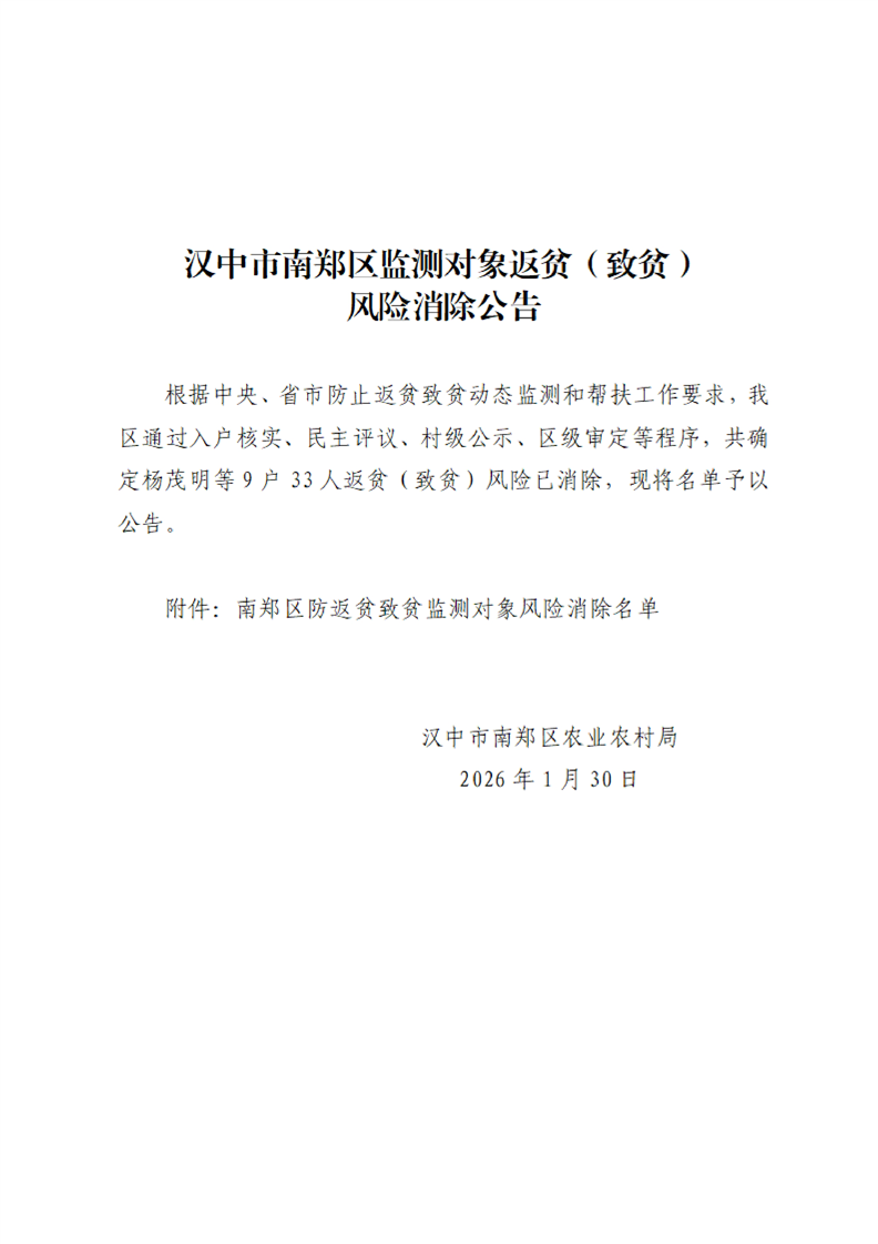 汉中市南郑区监测对象返贫(致贫)风险消除公告