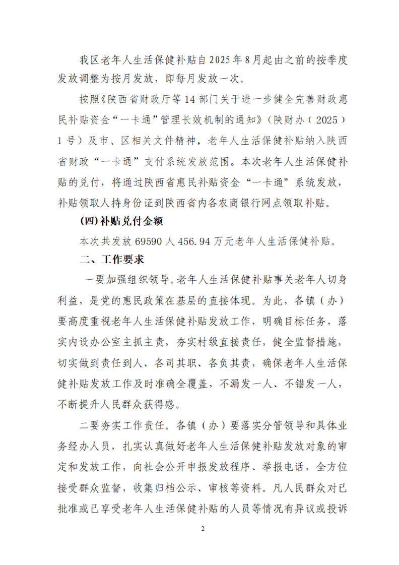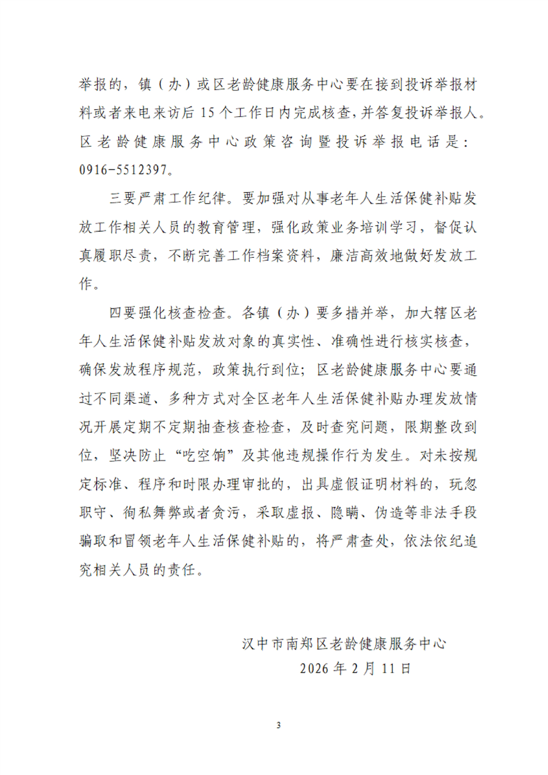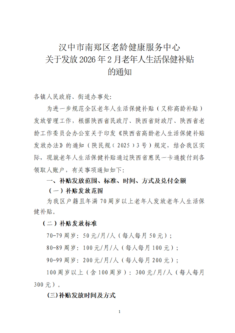 汉中市南郑区老龄健康服务中心关于发放2026年2月老年人生活保健补贴的通知