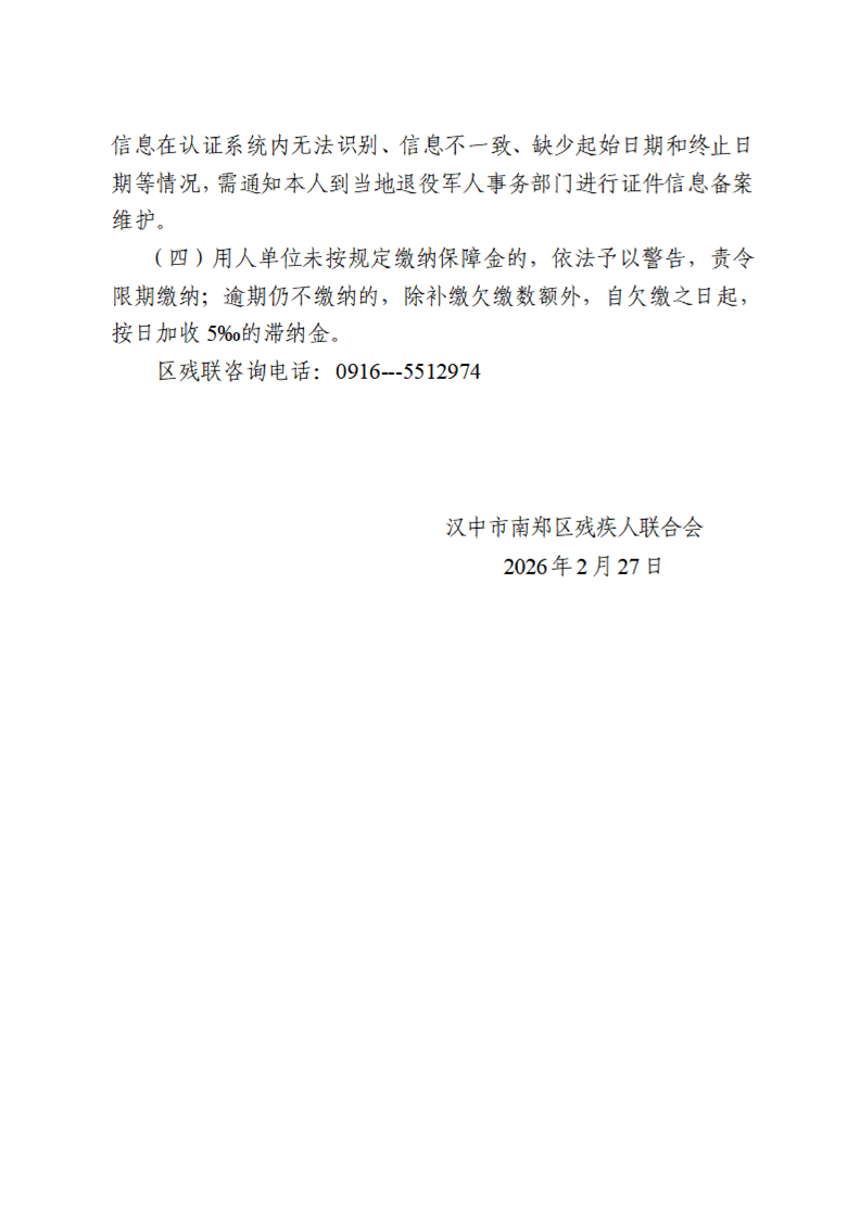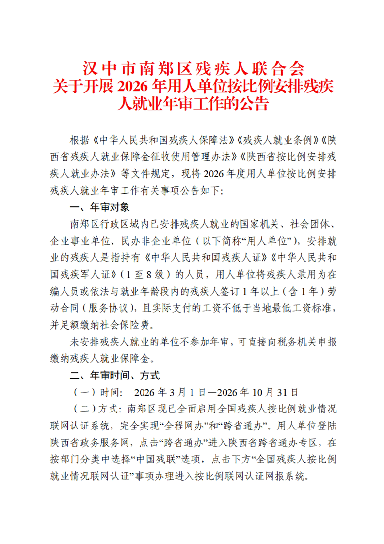 汉中市南郑区残疾人联合会关于开展2026年用人单位按比例安排残疾人就业年审工作的公告