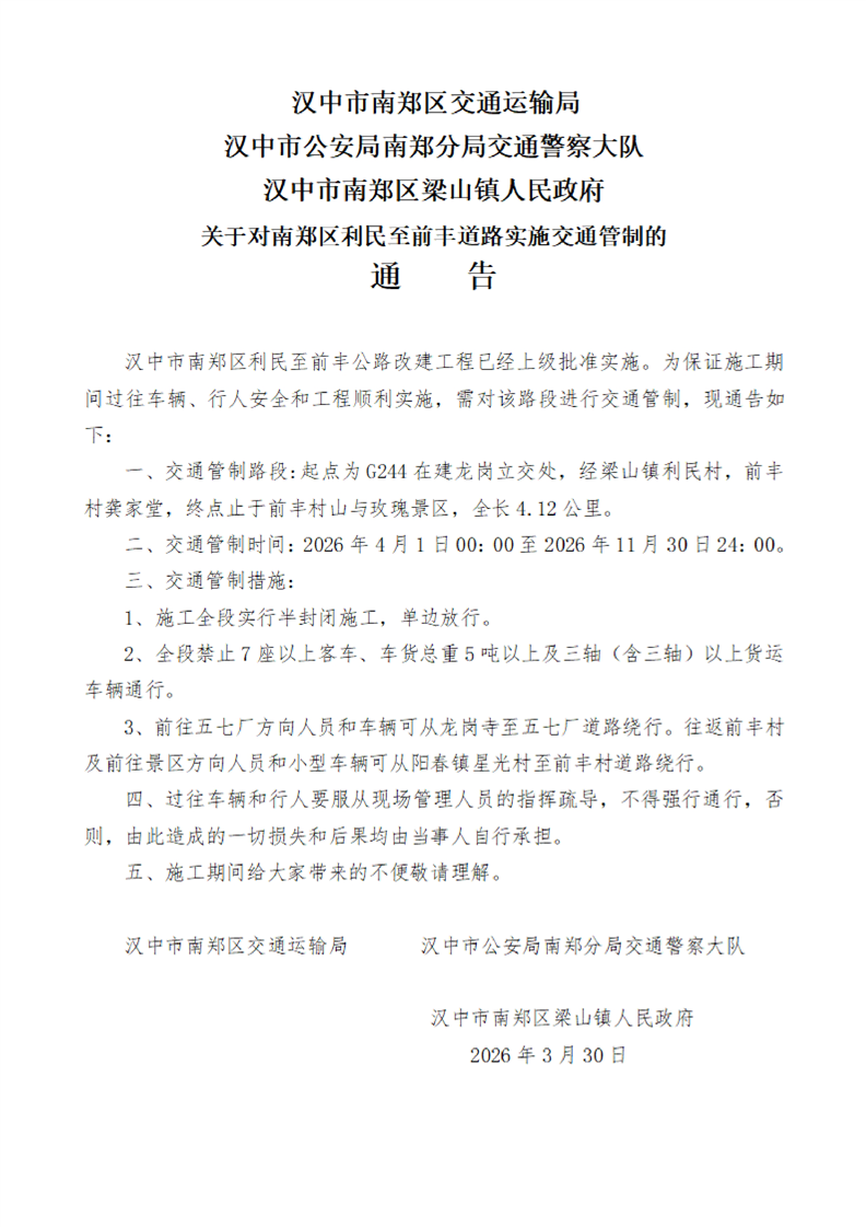 关于对南郑区利民至前丰道路实施交通管制的通告