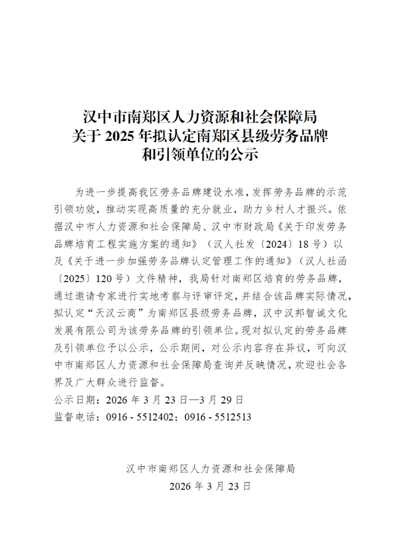 汉中市南郑区人力资源和社会保障局关于2025年拟认定南郑区县级劳务品牌和引领单位的公示
