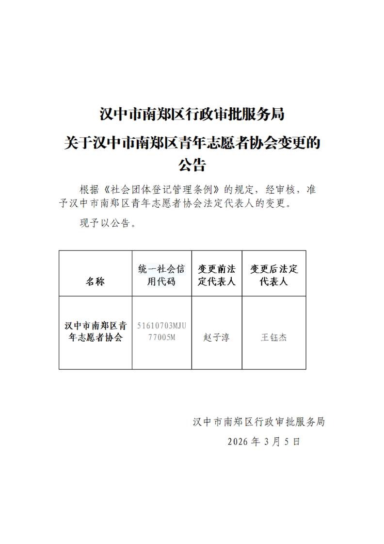 汉中市南郑区行政审批服务局关于汉中市南郑区青年志愿者协会变更的公告