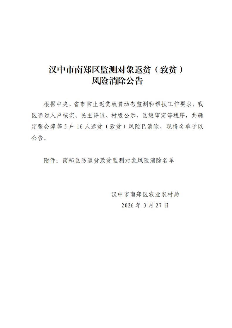 汉中市南郑区监测对象返贫(致贫)风险消除公告