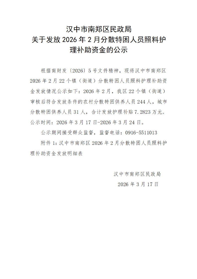 汉中市南郑区民政局关于发放2026年2月分散特困人员照料护理补助资金的公示