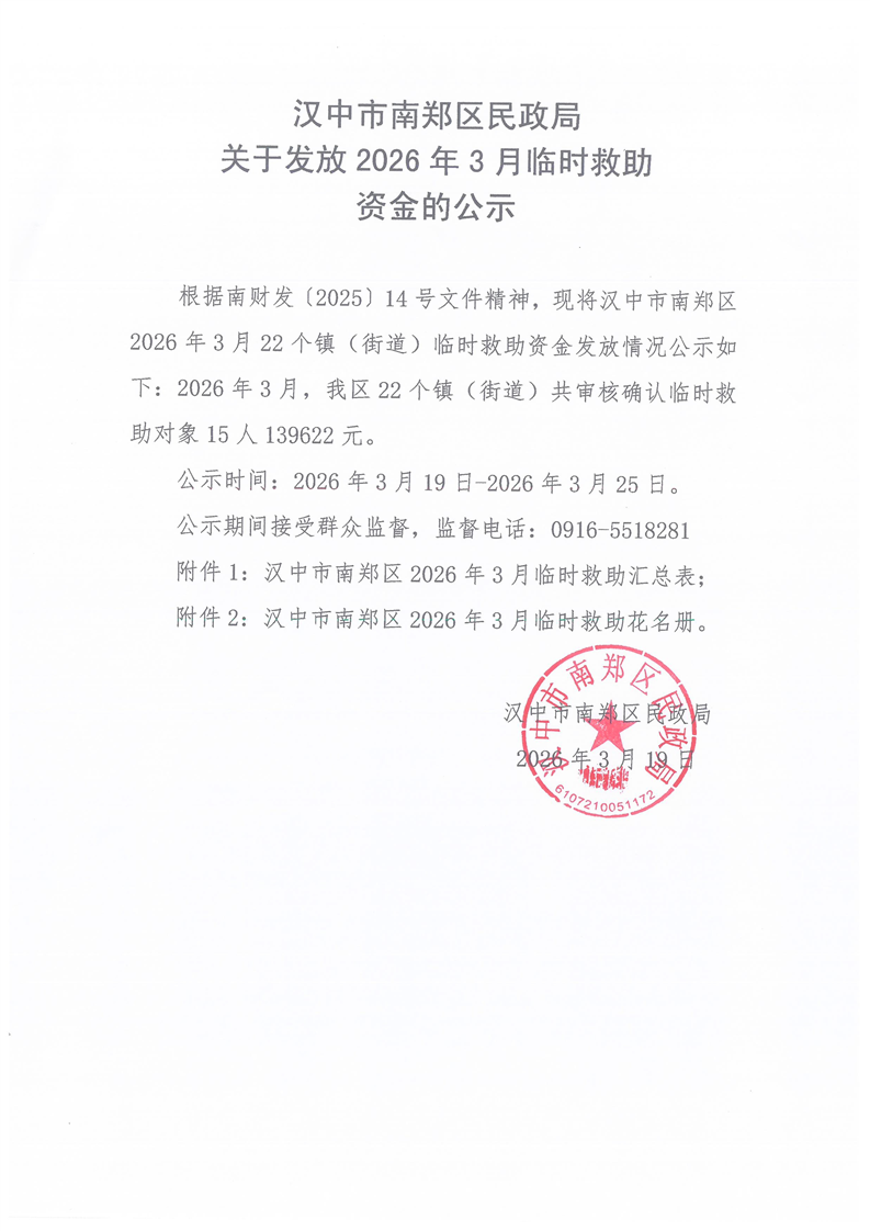 汉中市南郑区民政局关于发放2026年3月临时救助资金的公示