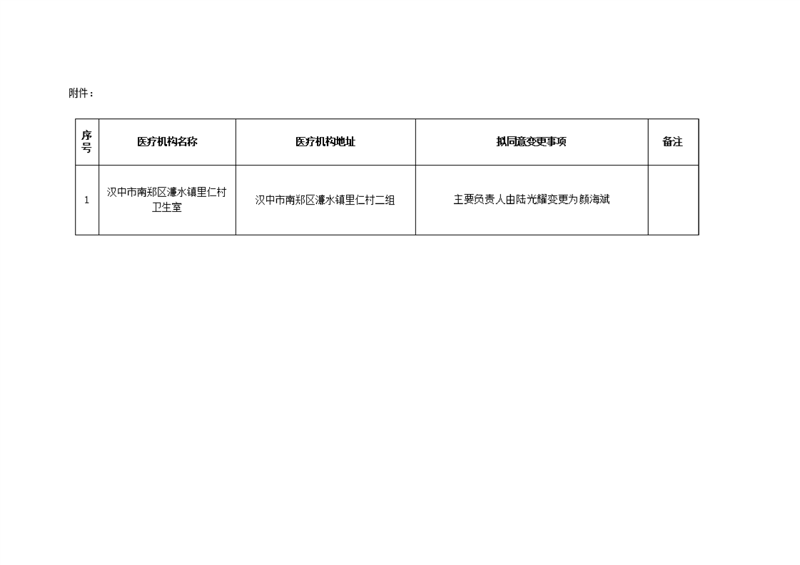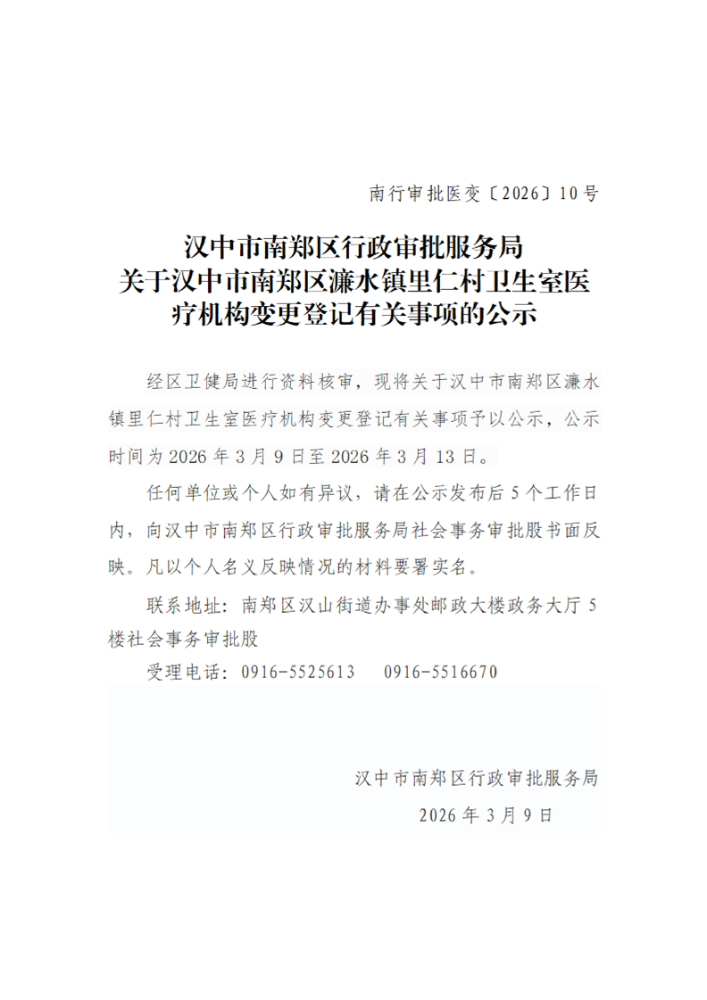 汉中市南郑区行政审批服务局关于汉中市南郑区濂水镇里仁村卫生室医疗机构变更登记有关事项的公示