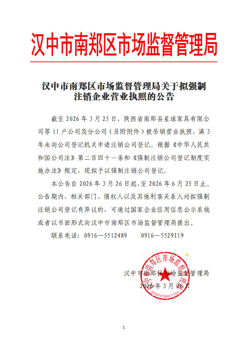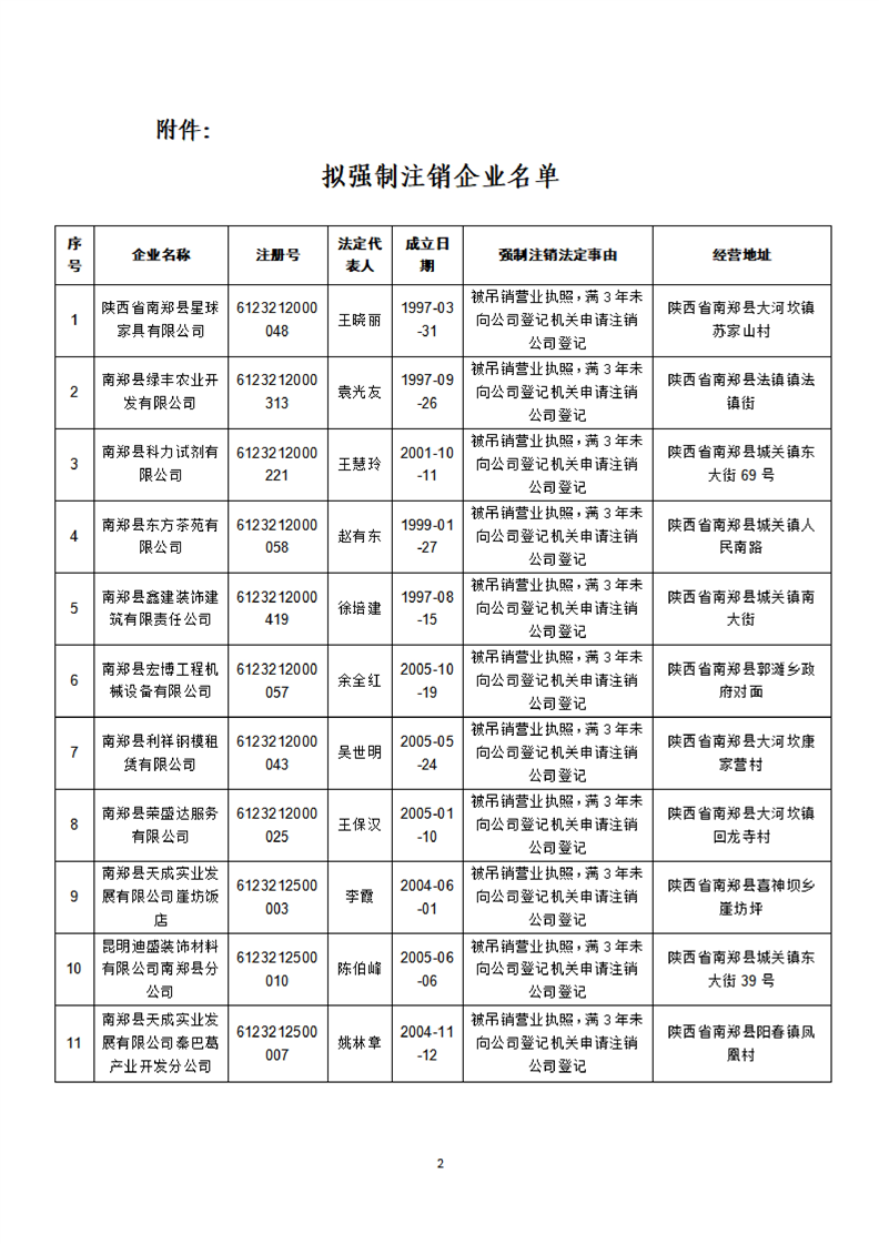 汉中市南郑区市场监督管理局关于拟强制注销企业营业执照的公告
