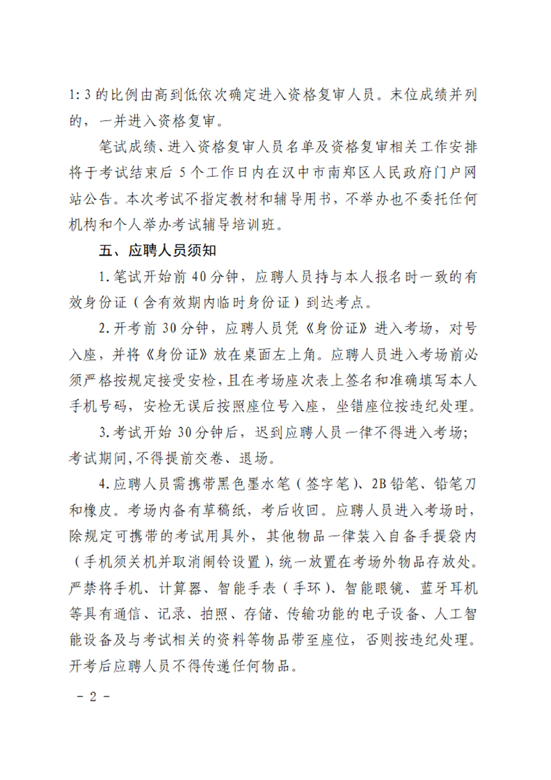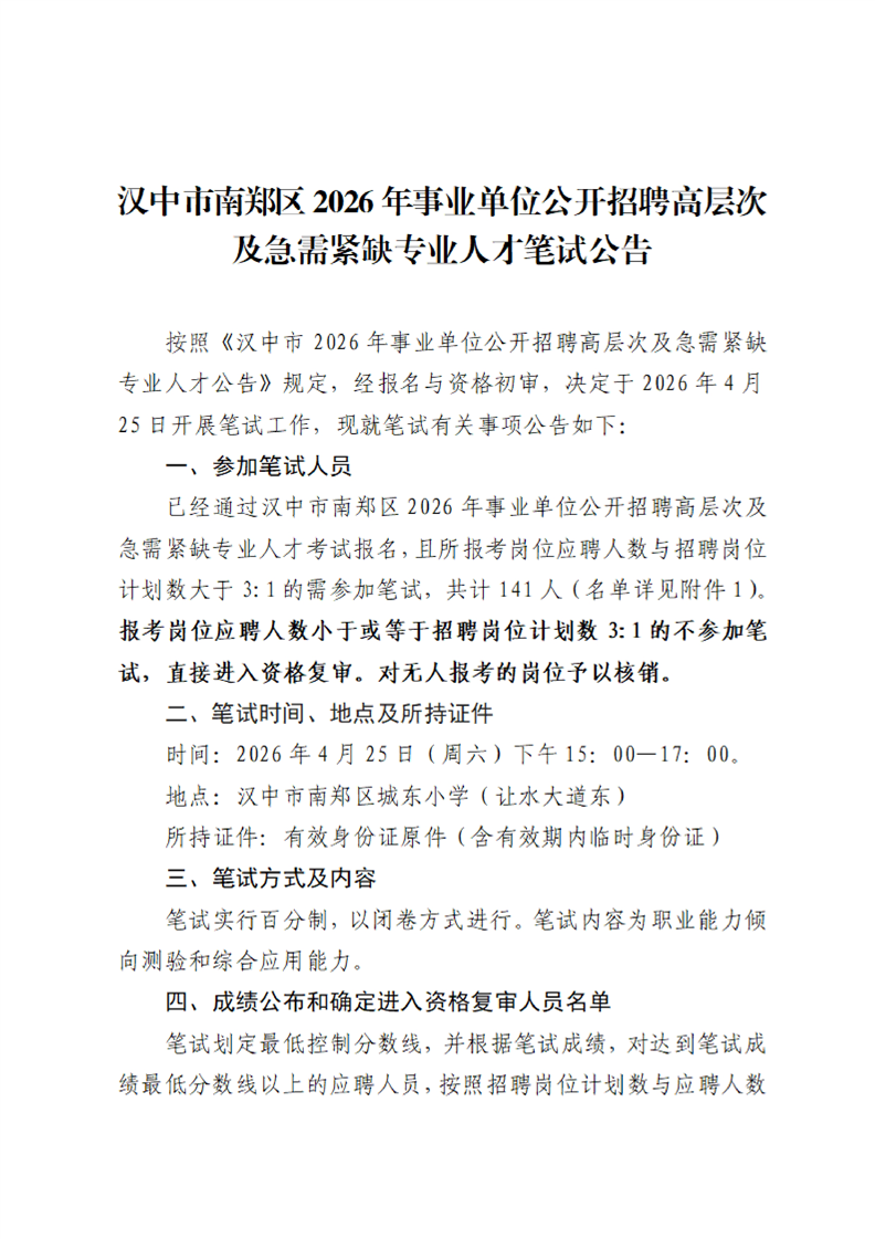 汉中市南郑区2026年事业单位公开招聘高层次及急需紧缺专业人才笔试公告