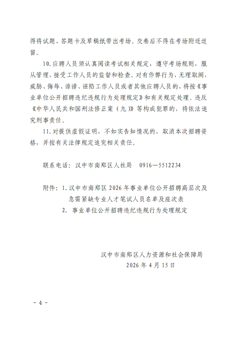 附件1:汉中市南郑区2026年事业单位公开招聘高层次及急需紧缺专业人才笔试人员名单及座次表