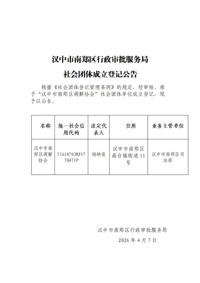 汉中市南郑区行政审批服务局社会团体成立登记公告