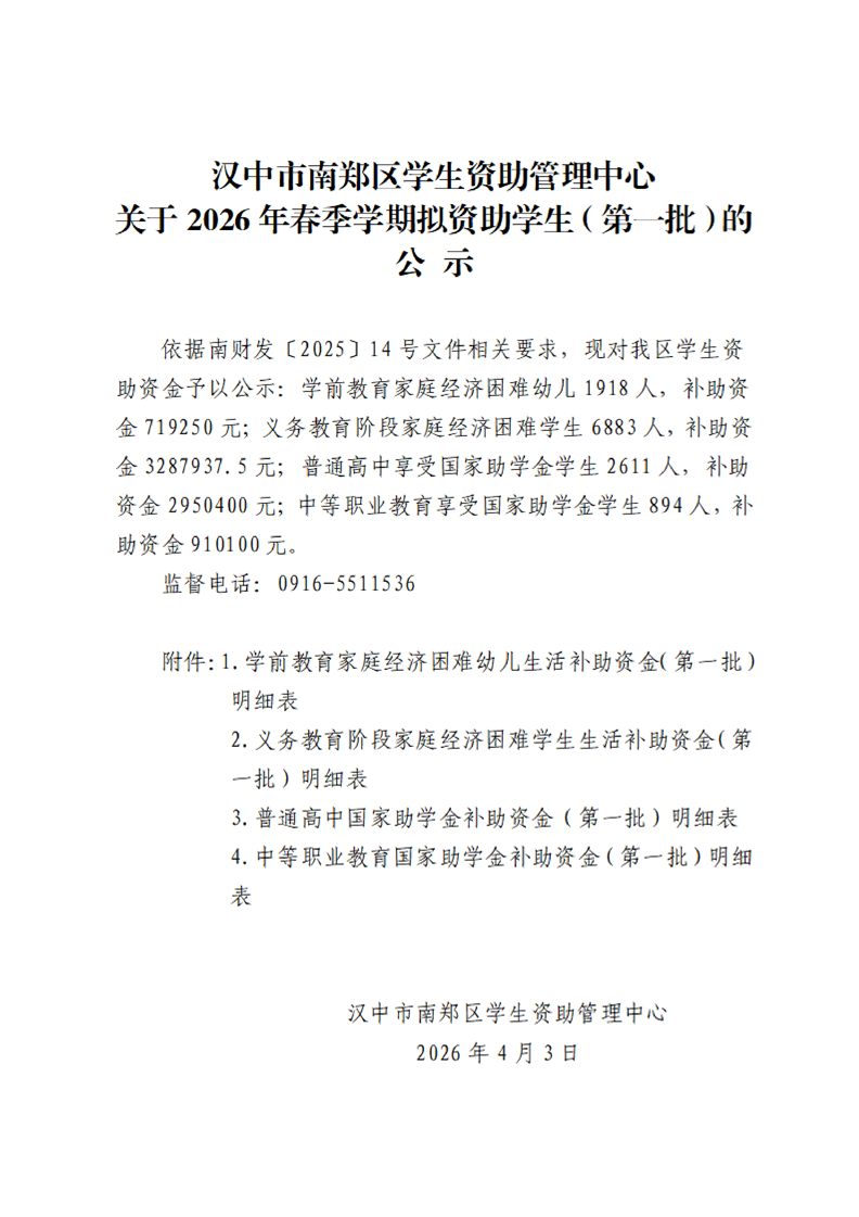 汉中市南郑区学生资助管理中心关于2026年春季学期拟资助学生(第一批)的公示