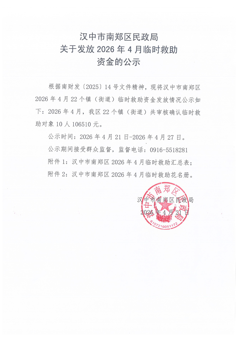 汉中市南郑区民政局关于发放2026年4月临时救助资金的公示