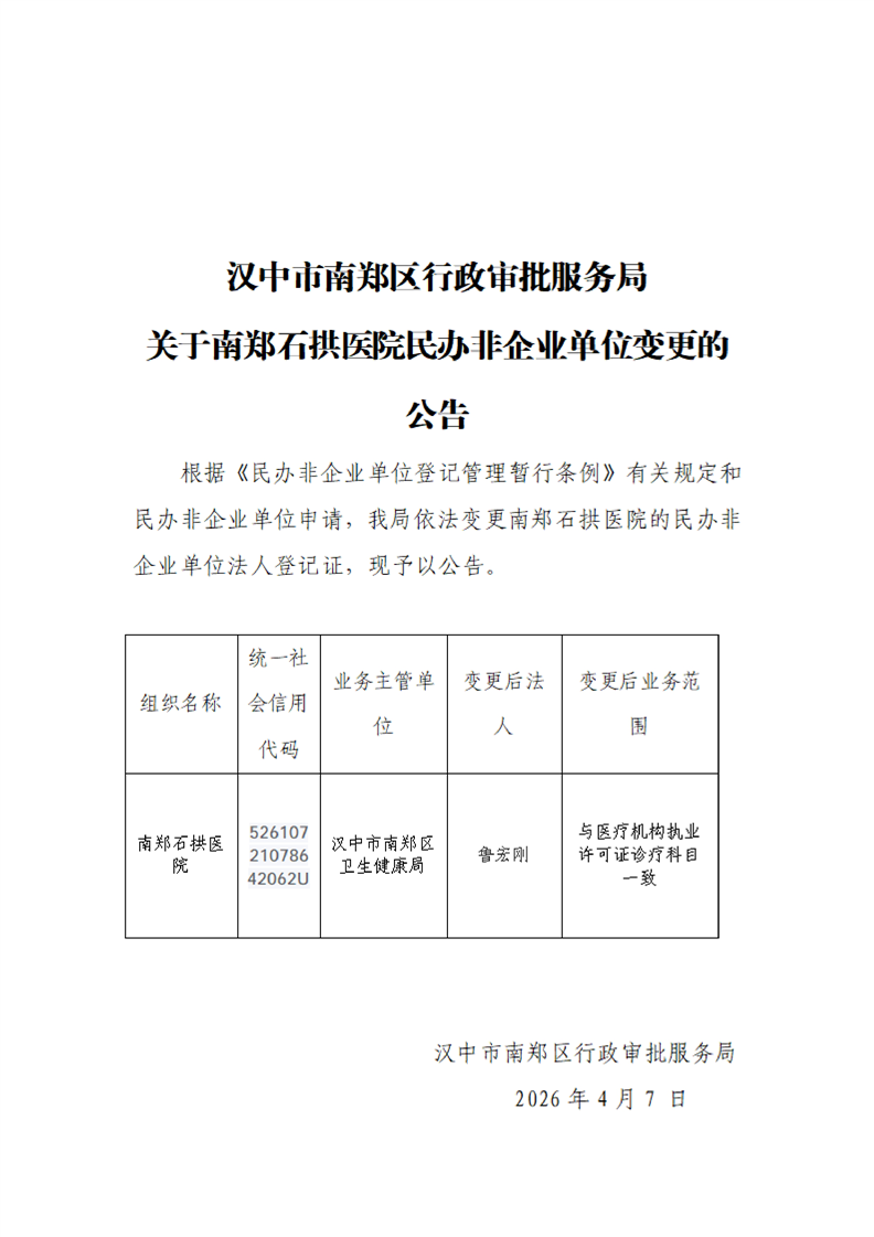 汉中市南郑区行政审批服务局关于南郑石拱医院民办非企业单位变更的公告
