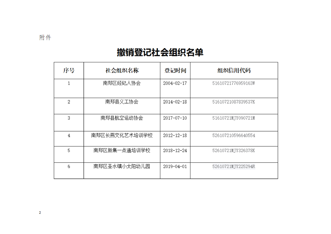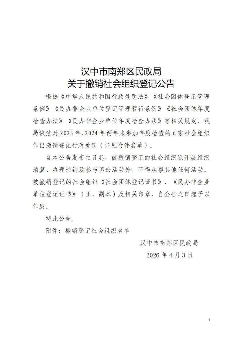汉中市南郑区民政局关于撤销社会组织登记公告